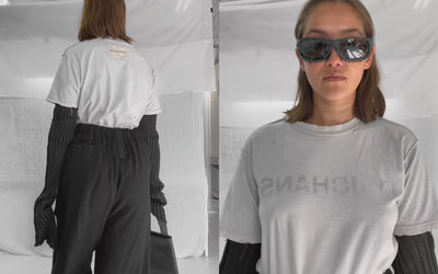 Cotton crew neck t-shirt with hand-printed NELLY JOHANSSON lettering. Each piece distressed and printed by hand. Soft cotton with relaxed fit.