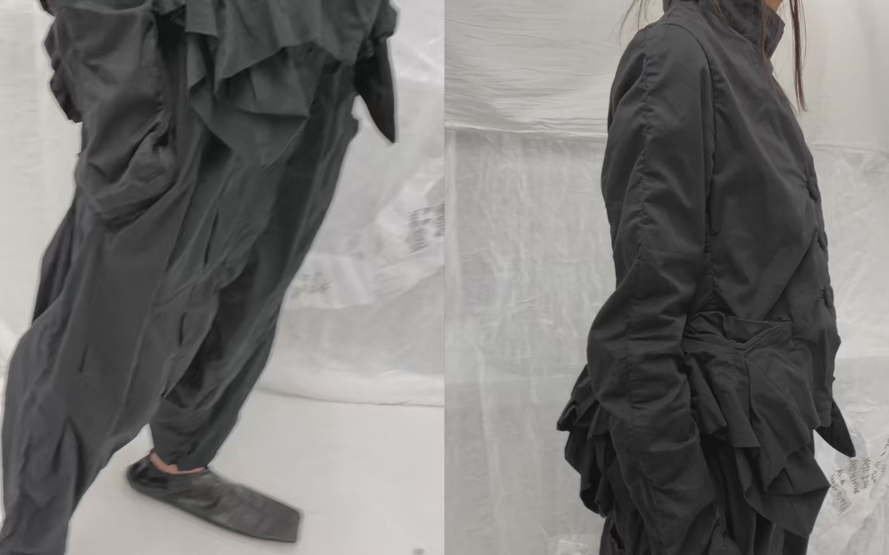 Cropped trousers with multiple pleats stitched across front and back panels. Soft cotton-modal blend with fluid drape. Side and back pockets, elasticized waist, buttoned fly.