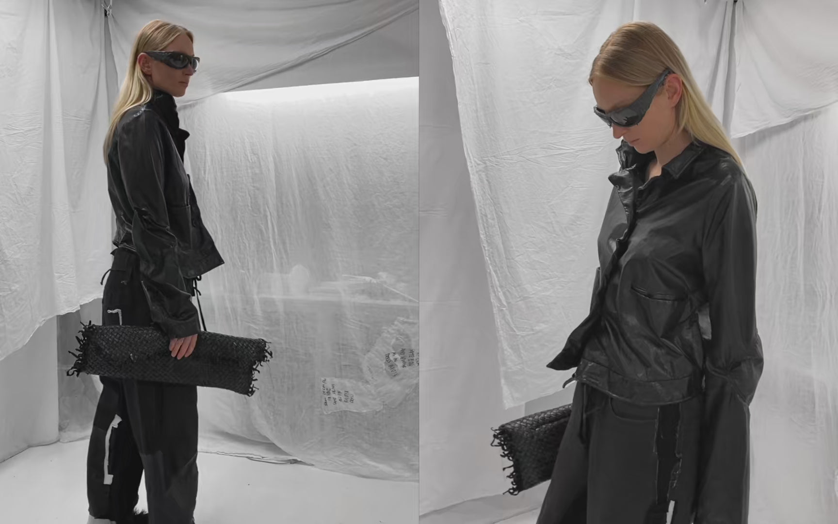 Cropped black lamb leather jacket with a sculptural wire-framed hem, asymmetric four-button front and angled welt pockets.