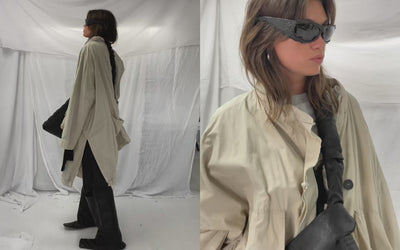 Oversized cotton parka with sculptural funnel neck and zipper closure. The cotton holds a firm hand with natural drape. Large draped cargo pockets and gathered hem create signature irregular structure.
