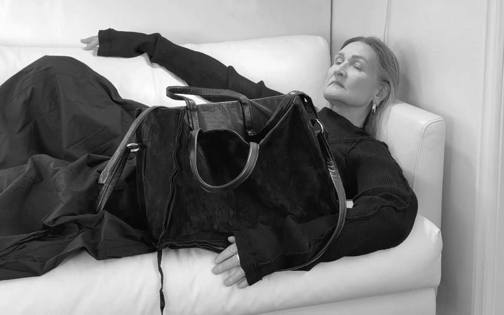 Reversible tote bag constructed from horse leather with smooth hide on one side, suede on the other. Features detachable shoulder strap with silver hardware. Supple yet structured with a firm hand.
