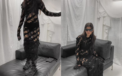 Long sleeve, fitted sweater with an all-over hand-crocheted open structure with raw, irregular holes and a sheer effect throughout. Finished with extended sleeves and sculpted shoulders.